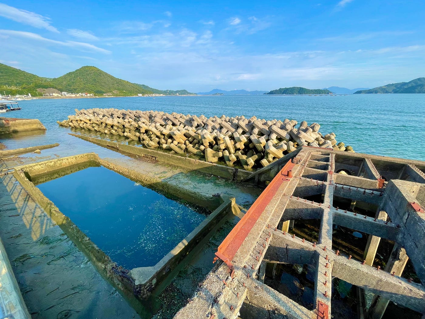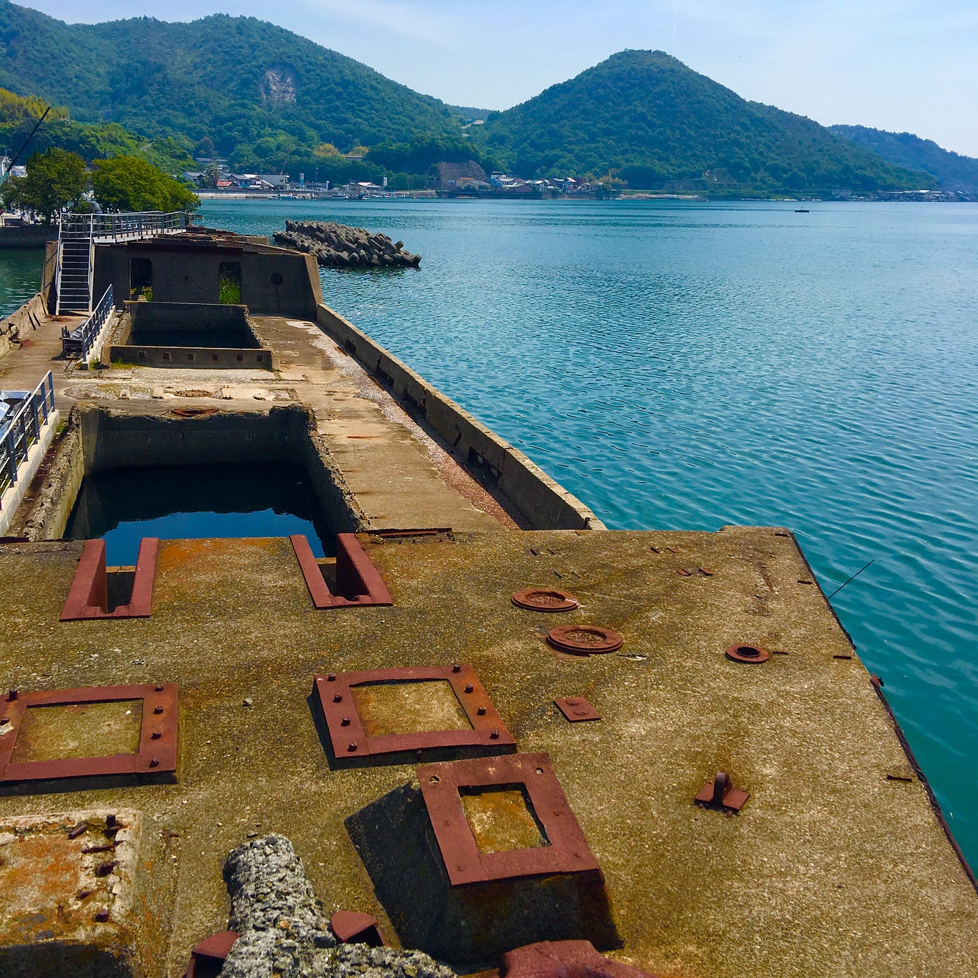 Anyway, this brings us to today, 80 years after the end of the war, and some 75 years after the breakwater work was completed. The two concrete ships still remain, and even now, they still act as a breakwater for Mitsuguchi Port in Yasuura. Until relatively recently, it was possible to access the ships, to walk along one side of the hulls and look down into the holds.